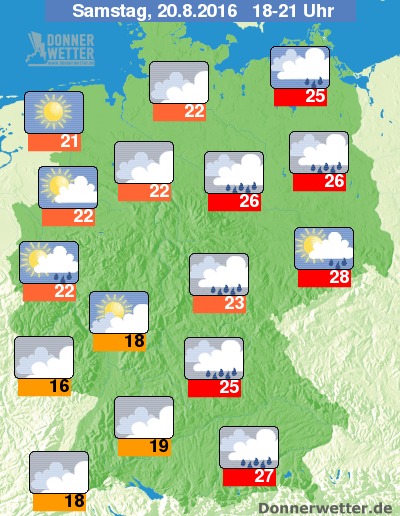Heute Abend fällt besonders über der Osthälfte Deutschlands noch verbreitet, teils kräftiger und gewittriger Regen. Weiter nach Westen hin werden die Wolkenlücken zahlreicher und größer und es treten nur selten einzelne Schauer auf. Ganz im Westen und Nordwesten ist es auch oft sonnig und dazu weitgehend trocken. Die Temperatur liegt bei etwa 16 Grad im Saargau und um 28 Grad in der Lausitz.