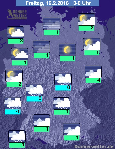 In der Nacht zum Freitag bleibt es über Schleswig-Holstein und Mecklenburg-Vorpommern meist stark bewölkt bei gelegentlich etwas Regen, vom Emsland bis in die Lausitz ist der Himmel locker bewölkt oder klar und es bleibt trocken, sonst ist zunächst verbreitet locker bis aufgelockert bewölkt und trocken. Im Nachtverlauf ziehen nach Süden hin jedoch dichte Wolken auf und es fällt zeitweise Regen, Schneeregen oder Schnee, dabei besteht erhöhte Glättegefahr! Die Temperatur sinkt auf 4 Grad in Dresden und bis -1 Grad im Saargau.