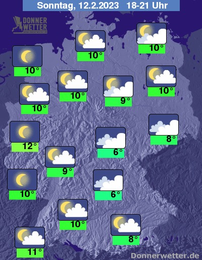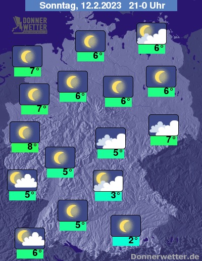 Die Temperaturen gehen bis Mitternacht auf Werte um 8 bis 7 Grad am Niederrhein und 2 Grad am Alpenrand zurück.
