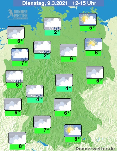 In den Nachmittags- und frühen Abendstunden bleibt der Himmel über weiten Landesteilen bedeckt, zeitweise Auflockerungen beschränken sich in den nächsten Stunden vor allem auf den Nordwesten und den äußersten Süden und Südwesten Deutschlands. Im Westen und Nordwesten muss immer wieder mit Niederschlägen gerechnet werden; diese fallen meist als Regen, oberhalb von 300 bis 400 m auch als Schneeregen oder Schnee.