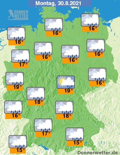 In der kommenden Nacht fällt zunächst vor allem im Süden und Westen weiterer Regen, sonst ist es oft stark, teils auch aufgelockert bewölkt und zunächst meist trocken. Im Laufe der Nacht zieht von der Ostsee her aus Nordosten zum Teil kräftiger Regen herein. In einem Streifen vom Niederrhein bis ins nördliche Bayern bleibt es aber bis zum Morgen hin weitgehend trocken. Die Temperatur sinkt auf 15 Grad in Stralsund und bis 9 Grad in Jena.