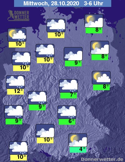 Bis zu den Frühstunden kühlt die Luft auf Werte um 9 bis 4 Grad ab, südlich der Donau kann es zu Bodenfrösten kommen. Im zweistelligen Bereich halten sich die Werte unter den Regenwolken an Niederrhein und Ems auf.