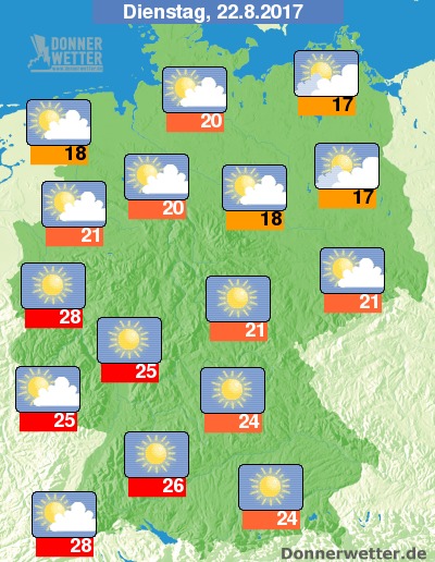 Am Dienstag zeigt sich das Wetter zum Großteil heiter bis sonnig, nur gebietsweise ziehen auch mal mehr Wolken durch, dabei bleibt es trocken. Die Temperatur steigt auf 17 Grad an der Müritz und bis 28 Grad im Oberrheingraben.