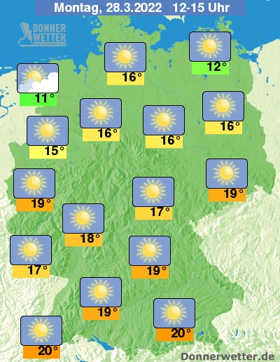 Heute Nachmittag scheint über dem Land verbreitet die Sonne und es zeigen sich nur vereinzelt, bevorzugt in Küstennähe einige Wolken, dabei bleibt es trocken. Die Temperatur liegt bei 11 Grad an der Nordsee und bis 20 Grad im Oberrheingraben.