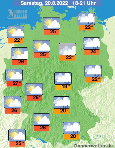 Heute Abend sind über der Osthälfte Deutschlands weitere Schauer möglich, dabei bleibt es noch überwiegend dicht bewölkt. Über der Westhälfte zeigt sich hingegen verbreitet die Sonne und es ziehen meist nur lockere Wolkenfelder durch, dabei bleibt es trocken. Die Temperatur liegt bei 19 Grad in Jena und bis 27 Grad in Köln.