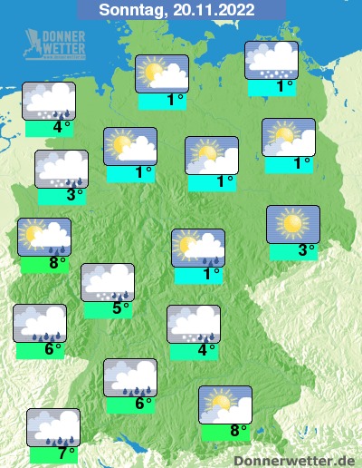 Am Sonntag ist es im Osten überwiegend heiter bis sonnig und dazu trocken. Im übrigen Land ist es verbreitet stark bis dicht bewölkt, dabei fällt hier und da Regen, Schneeregen oder Schnee. Die Temperatur steigt auf 1 Grad in Neubrandenburg und bis 8 Grad in München.