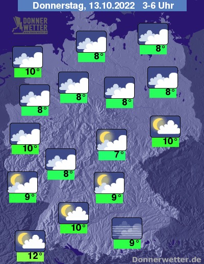 In der folgenden Nacht ist es im Süden und Osten noch oft locker bis aufgelockert bewölkt, sonst ziehen jedoch verbreitet schon meist dichte Wolken durch, dazu bleibt es trocken. Die Temperatur sinkt auf 12 Grad in Freiburg und etwa 7 Grad in Erfurt.