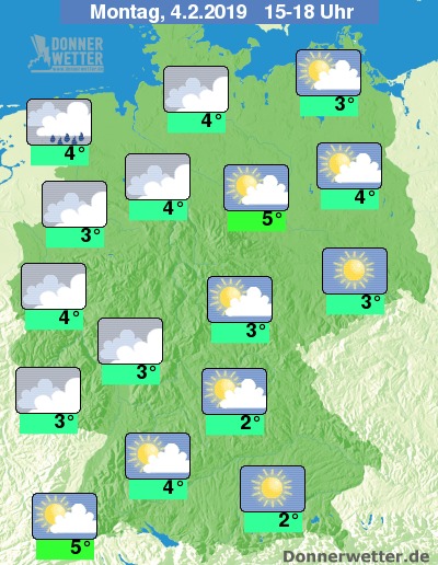 Die Temperaturen erreichen am Nachmittag Höchstwerte um 2 Grad C in Mittelfranken und um 5 Grad C am Hochrhein.