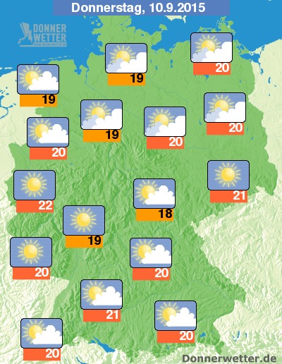 Heute scheint besonders im Westen die Sonne von einem häufig wolkenfreiem Himmel, aber auch sonst ist es über Deutschland verbreitet heiter bis wechselnd bewölkt. Im Norden ziehen hier und da auch mal dichtere Wolken durch, dabei bleibt es aber ebenso trocken. Die Temperatur steigt auf 18 Grad im Grabfeld und bis 22 Grad in Köln.