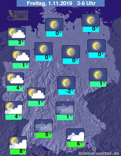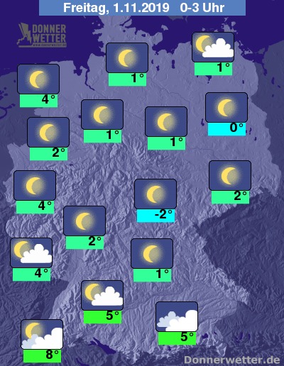 Die Halloween-Nacht wird überwiegend klar und bei Temperaturen von 8 Grad am Oberrhein und minus 2 Grad im Thüringer Land teils sehr kalt. In der zweiten Nachthälfte zeigt sich der Himmel im Süden und Westen leicht bewölkt.