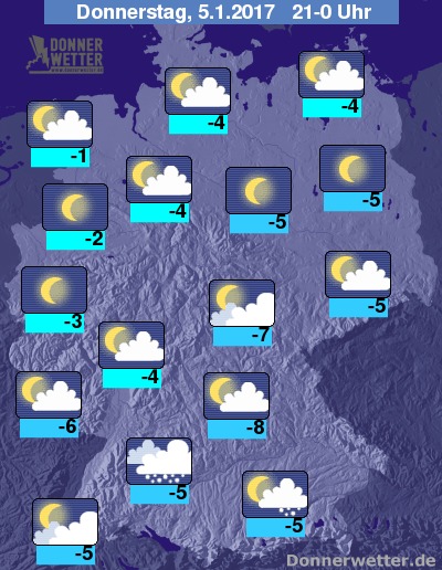 In der ersten Nachthälfte klart der Himmel vor allem in der Nordhälfte weitgehend auf und auch im Süden lassen die Schneefälle langsam nach. Dabei wird es bitterkalt. Im Süden fällt das Thermometer bis zum Morgen auf Tiefstwerte von bis zu -15 Grad.