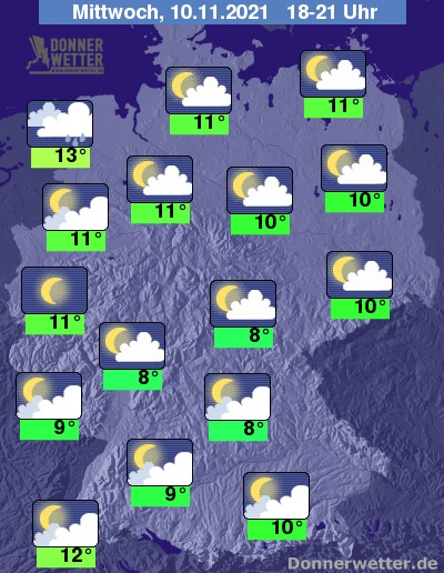 Am Donnerstag zeigt sich das Wetter im Süden oft heiter, teils neblig-trüb, im übrigen Bundesgebiet ist es überwiegend stark bewölkt oder bedeckt, dabei fällt aber nur selten etwas Regen. Die Temperatur erreicht 8 Grad im Eichsfeld und bis 14 Grad im Breisgau.