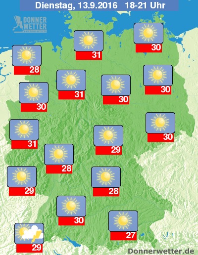 Heute Abend zeigt sich die Bundesrepublik verbreitet sonnig und dabei trocken. Nur selten ziehen auch mal lockere Wolkenfelder durch. Im Südwesten und stellenweise auch an der Nordsee besteht jedoch ein leichtes Schauer- und Gewitterrisiko. Die Temperatur liegt bei 27 Grad in München und etwa 31 Grad im Ruhrgebiet.