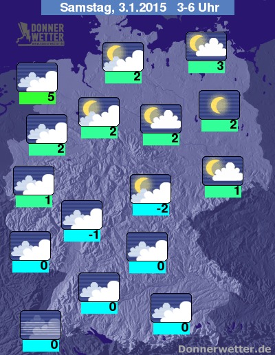 In der Nacht zum Samstag bleibt es im Süden des Landes stark bewölkt oder bedeckt, stellenweise bildet sich Nebel, aber auch im Westen ziehen wieder zunehmend dichte Wolken auf, dazu bleibt es weitgehend trocken. Im Norden und Osten Deutschlands ist es überwiegend locker bis aufgelockert, gebietsweise aber auch stark bewölkt, hier bleibt es trocken. Die Temperatur sinkt auf 5 Grad im Emsland und bis -2 Grad im Grabfeld. Im Norden weht weiterhin ein teils stürmischer, im Küstenumfeld ein teils orkanartiger Wind.