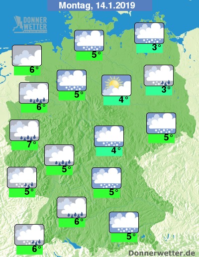 Am Montag ist es überwiegend stark, hier und da auch mal etwas aufgelockert bewölkt, es fällt gebietsweise Schnee, Schneeregen oder Regen. Die Temperatur steigt auf Werte zwischen 3 Grad in Rostock und bis 7 Grad in Bonn.