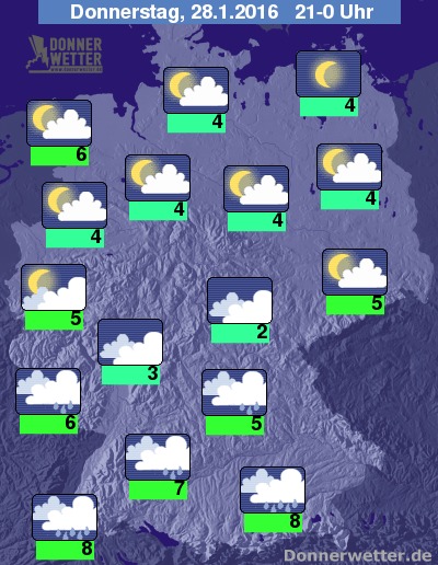 In der Nacht zum Freitag fällt im Süden weiterhin zeitweise Regen, der Niederschlag zieht sich aber zum Morgen hin mehr und mehr auf das Alpenvorland zurück. Nördlich des Regengebietes lockert die Bewölkung hier und da etwas auf und es bleibt trocken. Im übrigen Bundesgebiet ist es meist locker bis aufgelockert, hier und da aber auch mal stark bewölkt, jedoch zunächst trocken. Im weiteren Nachtverlauf ziehen im Nordseeumfeld und in Schleswig-Holstein jedoch dichte Wolken und Regen auf. Die Temperatur sinkt auf 7 Grad in München und bis 0 Grad im Grabfeld. Im Küstenumfeld weht starker und teils stürmischer, im übrigen Norden teils starker Wind.