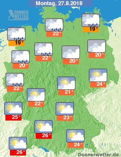 Am Montag zeigt sich das Wetter im Süden verbreitet heiter bis sonnig und trocken, über der Nordhälfte ziehen dagegen häufig dichte Wolken durch, dabei bilden sich gebietsweise Schauer, zum Teil zeigen sich aber auch Aufheiterungen. Die Temperatur steigt auf nur 19 Grad an den Küsten und bis 26 Grad am Oberrhein.