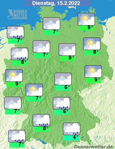 Am Dienstag bleibt es im Süden bedeckt, hier fällt gebietsweise Regen, an den Alpen Schnee. Sonst ist es zunächst teils aufgelockert, teils stark bewölkt, am Nachmittag setzt von Nordwesten her Regen ein. Die Temperatur steigt auf 4 Grad in München und bis 9 Grad in Rostock. Im Nordwesten weht zunehmend starker bis stürmischer Wind. An der Nordsee herrscht teils Sturm.