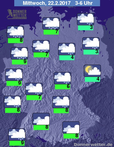 In der Nacht zum Mittwoch ziehen von Westen her kompakte Wolken durch und es fällt immer wieder Regen. Im Osten und Nordosten bleibt es anfangs noch trocken, aber gegen Morgen zieht auch hier Regen auf. Die Temperatur sinkt auf 9 Grad am Niederrhein und bis 3 Grad an der Müritz. An den Küsten weht ein starker und teils stürmischer Wind.