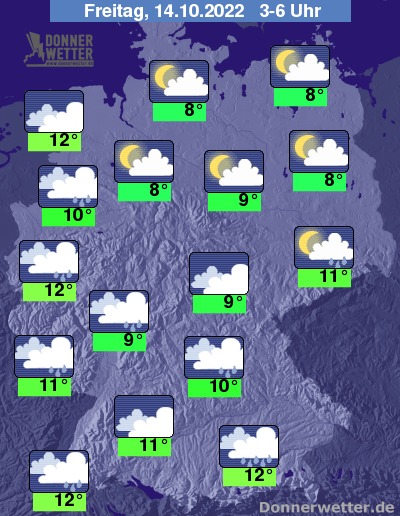 In der Nacht zum Freitag bleibt es über dem Nordosten und Norden Deutschlands überwiegend locker bewölkt und auch trocken. Ansonsten ziehen dagegen dichte Wolken übers Land und es fällt zeitweise Regen. Stellenweise bildet sich auch Nebel. Die Temperatur sinkt auf 12 Grad in München und 8 Grad in Hamburg.