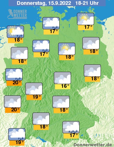 Heute Abend ist es über der Südhälfte dicht bewölkt und es bilden sich gebietsweise noch Schauer. Im übrigen Land ist es größtenteils stark, hier und da aber auch aufgelockert bewölkt, dabei bilden sich nur einzelne Schauer. Die Temperatur liegt bei 16 Grad im Thüringer Becken und bis 20 Grad im Rheinland.