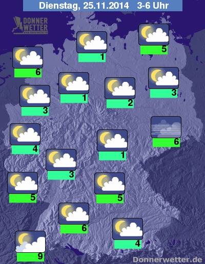 In der Nacht zum Dienstag bleibt es überwiegend bei der lockeren bis aufgelockerten Bewölkung. Zeitweise dichte Wolken ziehen jedoch im Südwesten der Republik durch, hier kann es vereinzelt etwas tröpfeln, sonst bliebt es aber trocken. Es bildet sich regional Nebel oder Hochnebel. Die Tiefstwerte liegen bei teils 9 Grad im Breisgau und etwa 1 Grad im Thüringer Becken, dabei besteht Gefahr durch mögliche Reifglätte.