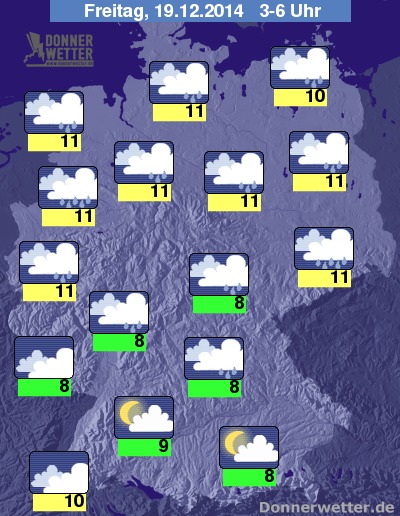 In der Nacht zum Freitag lockert die Bewölkung im Süden des Landes zunehmend etwas auf und es bleibt hier weitgehend trocken. In den übrigen Landesteilen bleibt es dagegen bedeckt und es fällt immer wieder Regen. Der Wind weht meist frisch, teils auch stark und an der See auch stürmisch. Die Temperatur sinkt auf 11 Grad in Berlin und 8 Grad am Alpenrand.