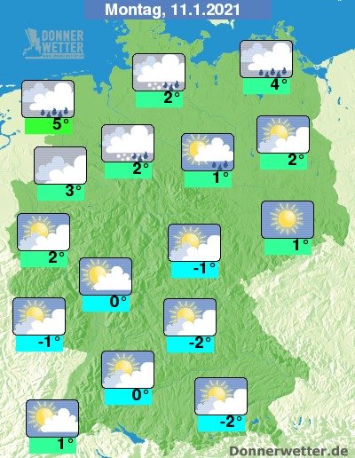 Am Montag ziehen zunächst lediglich im Nordseeumfeld dichte Wolken durch, die hier schon für zeitweiligen Regen sorgen. Weiter nach Südosten hin ist es dagegen anfangs oft heiter bis sonnig, teils auch trüb, jedoch trocken. Im Tagesverlauf zieht es sich auch über der übrigen Nordwesthälfte zu und es setzt Regen, anfangs auch Schnee und Schneeregen ein. Im übrigen Land ist es teils stark bewölkt, teils noch sonnig, dabei bleibt es meist trocken. Die Temperatur erreicht -2 Grad in Nürnberg und bis zu 5 Grad an der Nordseeküste.