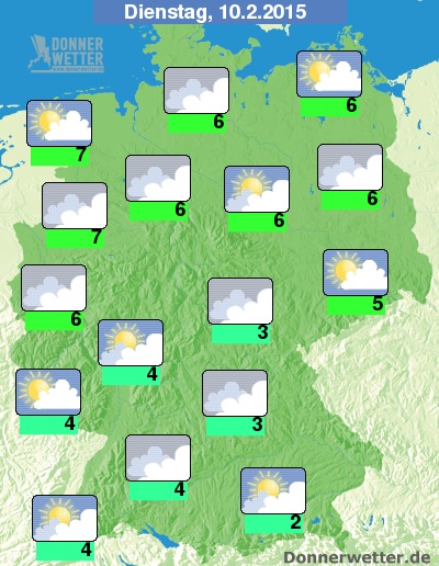 Am Dienstag bleibt es noch meist stark bewölkt oder bedeckt, jedoch fallen nur noch selten ein paar Tropfen und gebietsweise kann sich auch schon mal die Sonne zeigen. Die Höchstwerte erreichen 2 Grad in Augsburg und bis 7 Grad in Osnabrück.