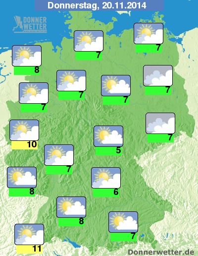 Am Donnerstag zieht verbreitet aufgelockerte Bewölkung durch, dabei kann sich die Sonne hier und da auch mal etwas länger zeigen, vor allem im Osten, gebietsweise aber auch in den anderen Landesteilen, ist es aber auch noch dicht bewölkt, dabei bleibt es aber trocken. Die Temperatur steigt auf 5 Grad im Eichsfeld und bis 11 Grad im Breisgau.