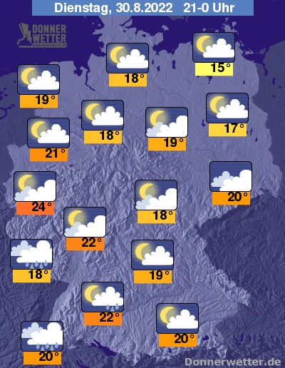 Die Temperaturen gehen bis Mitternacht auf Werte um 24 Grad im Rheinland und 15 Grad an der Ostseeküste zurück.