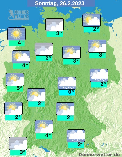 Am Sonntag zeigt sich das Wetter im Norden und Westen zeitweise heiter und trocken, teils können sich auch einige Wolken halten, dazu bleibt es trocken. Über der Südosthälfte halten sich zumeist dichte Wolken und es können sich einzelne Schneeschauer bilden. Die Temperatur steigt nur auf 0 Grad in Erfurt und bis 5 Grad in der Kölner Bucht.