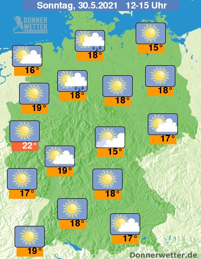 Heute Nachmittag präsentiert sich das Wetter im Land verbreitet heiter oder sonnig. Ein leichtes Schauerrisiko besteht lediglich im Norddeutschen Raum, ansonsten bleibt es landesweit trocken. Die Temperatur liegt bei 15 Grad im Vogtland und bis 22 Grad in Köln.