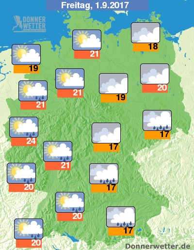 Die Temperaturen liegen am Freitag zwischen 17 Grad in Thüringen und 24 Grad in Köln.