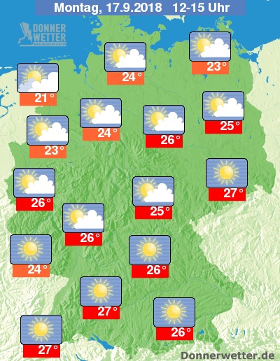Am Mittag und Nachmittag zeigt sich der Himmel über der Nordhälfte des Landes meist heiter oder nur locker bewölkt, südlich des Mains dominiert hingegen sonniges Wetter. Schauer sind nicht zu erwarten.