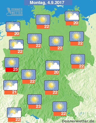 Zum Wochenstart erwartet uns verbreitet sonniges und sonst locker bewölktes Spätsommerwetter. Entlang von Ober- und Mittelrhein können auch mal einige Wolken durchziehen. Das Schauerrisiko bleibt aber auch hier nur gering. Die Temperatur steigt auf etwa 20 Grad an den deutschen Küsten und bis 25 Grad im Rheinland.