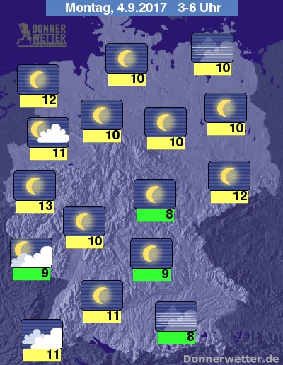 In der bevorstehenden Nacht zeigt sich der Himmel über der Bundesrepublik vor allem entlang des Rheins gebietsweise locker bewölkt, sonst ist es jedoch überwiegend sternenklar, dazu bleibt es trocken. Die Temperatur sinkt auf 13 Grad in Bonn und bis 8 Grad in Rosenheim.
