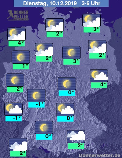 In der Nacht zum Dienstag ziehen sich die dichten Wolken und die Schnee-, Schneeregen- und Regenfälle immer weiter in den Südosten Deutschlands zurück. Dahinter lockert und klart der Himmel verbreitet auf und es bleibt trocken. Die Temperatur sinkt auf 4 Grad in Emden und bis -1 Grad am Taunus. An den Küsten weht noch ein oft stürmischer Wind, dabei sind anfangs teils oraknartige Böen möglich.