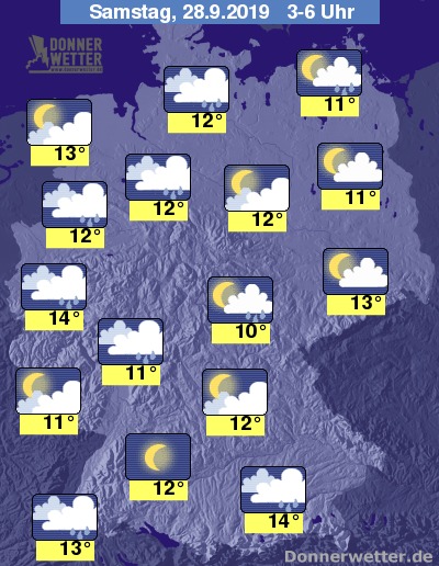 Am Abend regnet es in einem Streifen vom Oberrhein bis nach Sachsen. Auch südlich der Donau können teilweise Regen- oder Schauerwolken aufziehen. Im übrigen Land wechseln sich kurze freundliche Abschnitte mit Schauerwolken ab. Vereinzelt kann es auch blitzen und donnern. Im Rhein-Main-Gebiet und im Westen kann man die untergehende Sonne am ehesten beobachten.