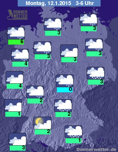 Am Montag bleibt die Wolkendecke weitestgehend verschlossen und nur sehr selten kann sich die Sonne mal zeigen. Besonders im Norden, aber auch in der Mitte fällt zeitweise etwas Regen, im Süden bleibt es dagegen überwiegend trocken. Die Temperatur steigt auf 2 Grad im Vogtland und bis auf 8 Grad in Ostfriesland. Dazu weht verbreitet starker Wind mit stürmischen Böen, vereinzelt sind Sturmböen möglich. An der Küste und auf den Bergen herrscht zum Teil Sturm, dabei sind orkanartige Böen möglich.