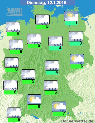 Am Dienstag ist es weiterhin nasskalt und besonders im Süden auch teils stürmisch. Es fällt immer wieder Regen und zum Teil auch Schneeregen oder Schnee, dabei besteht örtlich Glättegefahr! Die Temperatur steigt auf 1 Grad an der Müritz und bis 8 Grad im Rheinland.