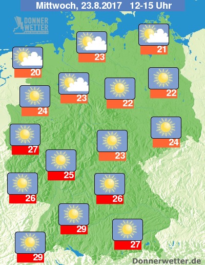 Heute Nachmittag scheint die Sonne zum Großteil von einem stahlblauen Himmel, hier und da können nur lockere Wolken vorüberziehen, dabei bleibt es trocken. Die Temperatur liegt bei 20 Grad direkt an der Nordsee und etwa 29 Grad in Stuttgart.