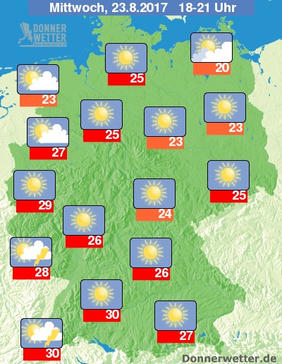 Heute Abend besteht entlang des Oberrheins ein leichtes Schauer- und Gewitterrisiko. Im übrigen Bundesgebiet bleibt es jedoch überwiegend sonnig und sonst nur locker bewölkt, dabei bleibt es trocken. Die Temperatur liegt bei etwa 20 Grad auf Rügen und um 30 Grad in Freiburg.