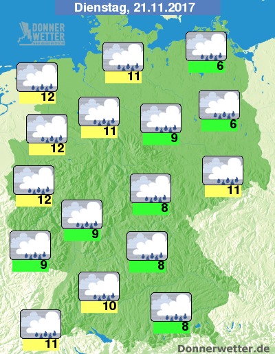 Am Dienstag ist es weiterhin wolkenverhangen und es fällt verbreitet Regen, regional auch kräftig oder langanhaltend. Die Temperatur steigt auf 6 Grad an der Müritz und bis 12 Grad entlang des Niederrheins.