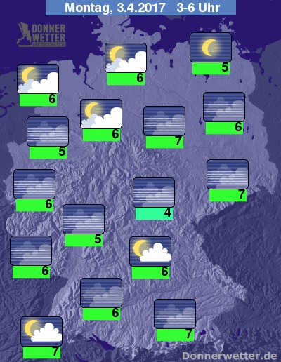 In der Nacht zum Montag klingen letzte Schauer im Süden ab und nach und nach lockert es auch hier immer weiter auf. In den anderen Landesteilen ist es anfangs schon meist sternenklar und bleibt es auch bis zum Morgen. Einige Wolkenfelder sind im Nordwesten Deutschlands zu erwarten. Es bleibt trocken bei recht einheitlichen Tiefstwerten von 7 bis 4 Grad.