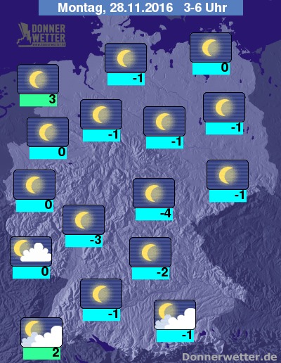 In der Nacht zum Montag klart der Himmel über dem Bundesgebiet verbreitet auf. Vor allem im Süden bleibt es jedoch zunächst auch noch oft stärker bewölkt, dazu aber ebenfalls trocken. Im weiteren Verlauf lockert es aber auch hier auf. Die Temperatur sinken auf oft frostige Werte zwischen 3 und -4 Grad.