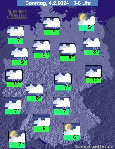 In der Nacht auf Sonntag bleibt es südlich der Donau häufig aufgelockert bewölkt und es ist trocken; sonst überwiegt dichte Bewölkung oder der Himmel ist bedeckt. Dabei muss verbreitet mit Regen gerechnet werden. Es bleibt windig bis stürmisch.