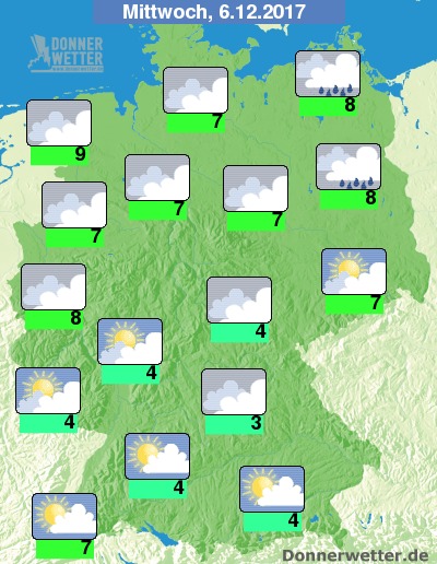 Meistens dominieren zähe Wolken, vor allem in höheren Lagen ist es auch neblig trübe. In der Nordhälfte kann es stellenweise etwas tröpfeln oder nieseln. Im Süden und Südwesten könnte sich das Einheitsgrau gebietsweise auch mal längere Zeit lichten und der Sonne Platz machen. Die Höchsttemperaturen liegen in der Nordhälfte zwischen 5 und 10 Grad, in der Südhälfte zwischen 1 und 6 Grad, nur bei Sonnenschein kann es auch hier etwas wärmer werden. Der Wind bläst im Norden und Osten spürbar und kommt aus Südwest bis West, im Süden weht er eher schwach.