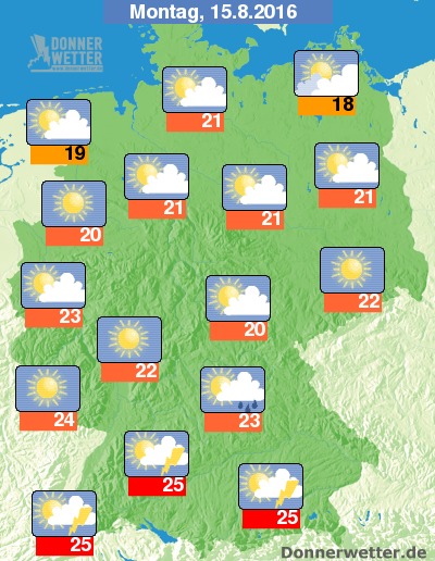 Am Montag ist es im Land überwiegend heiter bis sonnig, im Norden und teils auch über der breiten Landesmitte können auch mal einige Wolken durchziehen, dabei bleibt es aber weitgehend trocken. Im Süden ist es oft sonnig, im Alpenvorland sind jedoch auch einzelne Schauer und Gewitter möglich. Es werden 18 bis 25 Grad erreicht.