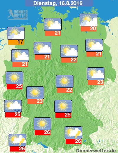Am Dienstag ziehen im Norden zum Teil einige Wolken durch, sonst ist es jedoch verbreitet heiter oder sonnig, dabei bleibt es trocken. Im Alpenvorland sind bei teils dichten Quellwolken aber auch vereinzelt Schauer oder Gewitter möglich Es werden 17 bis 26 Grad erreicht.